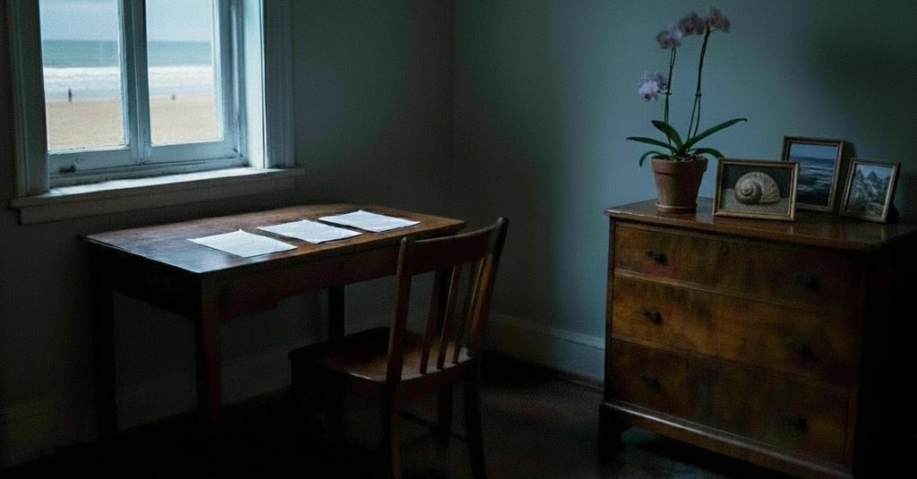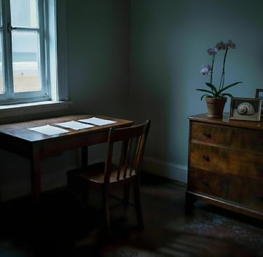 L’habitació estava buida, a excepció d’un escriptori, una cadira, una petita làmpara de peu i un test amb orquídies. Al costat de la làmpara, hi havia una calaixera amb plats a dins, i tres fotografies emmarcades. Totes les superfícies estaven cobertes per una fina capa de pols; totes excepte dos fulls, que brillaven amb netedat a sobre de la taula. Un d’ells era una fotografia d’un collaret fet amb un safir que brillava com un mar durant l’estiu a la Costa Brava. L’altre full era un text escrit a mà.